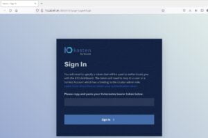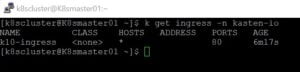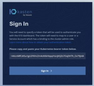 Vemos que Kasten se ha instalado exitosamente, y que podemos acceder via browser siempre que el Ingress Controller esté funcionando adecuadamente. En mi caso, el Ingress Controller está configurado para recibir el trafico HTTP a través de los puerto 30000 de los workers, por lo que en el browser puero acceder a través de la siguiente dirección utilizando la IP de uno de los workers > http://172.20.10.134:30000/k10/#/